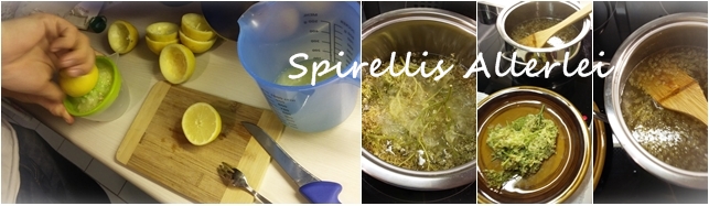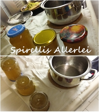 Doch dann wurde die Harmonie jäh zerstört, als der große Holzlöffel kam, und alles durcheinander rührte, während die Temperatur bedrohlich im Topf stieg. Die Dolden wurden herausgenommen, jedoch konnten sich ein paar Blüten bei den Zitronen festhalten.