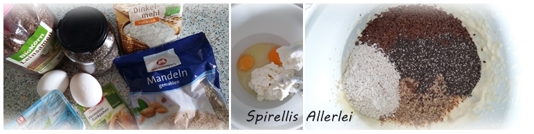 Eier mit Quark anschlagen, dann alle trockenen Zutaten hinzugeben und gut vermengen, sodass keine Teigklümpchen entstehen,