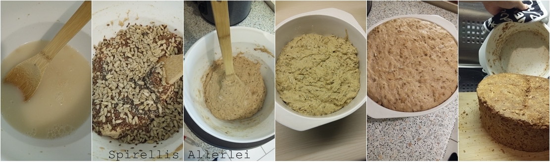 Das Wasser wird mit der Hefe verrührt, dann kommen Mehl und Kerne dazu. Zuletzt gebt ihr dann das Salz und den Essig dazu und verrührt alles zu einem glatten Teig, nicht beunruhigt sein, wenn der noch etwas klebrig ist.