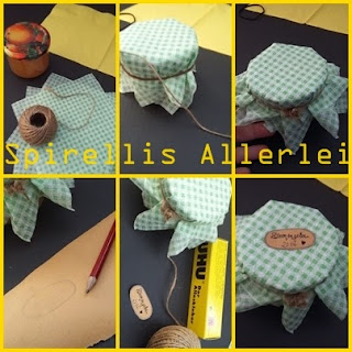 Wenn das dann geschafft ist, hinten auf das Schildchen einen kleinen Klecks Alleskleber geben und auf die Serviette oder den Stoff drücken, den ihr zum Glas verdecken genommen habt.
