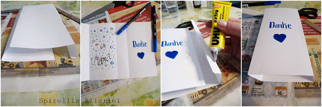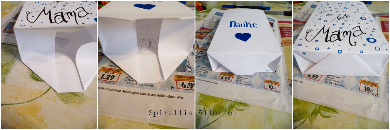Und Et voilá – fertig ist eure eigene kleine Geschenktüte. Ihr könnt statt dem A4 Blatt natürlich auch Zeitung nehmen – hab ich auch gemacht – in der großen Tüte hatte ich dann alles gemeinsam reingepackt und Mutti einen Zettel dran geklemmt: Erst am Muttertag öffnen 🙂