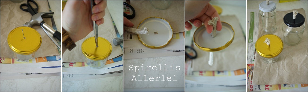 Die Überstände nach innen biegen und da gleich nochmal mit dem Hammer festklopfen. Nun könnt ihr schon die Dochte durch fädeln. Schaut dabei, dass der Docht nicht zu weit oben aus dem Deckel heraus schaut. Der wird immer mal noch nach gezogen, wenn er etwas runter gebrannt ist. Die Länge der Dochte ist übrigens nicht so enorm, weshalb ich für größere bzw. höhere Gläser längere Dochte empfehlen würde.