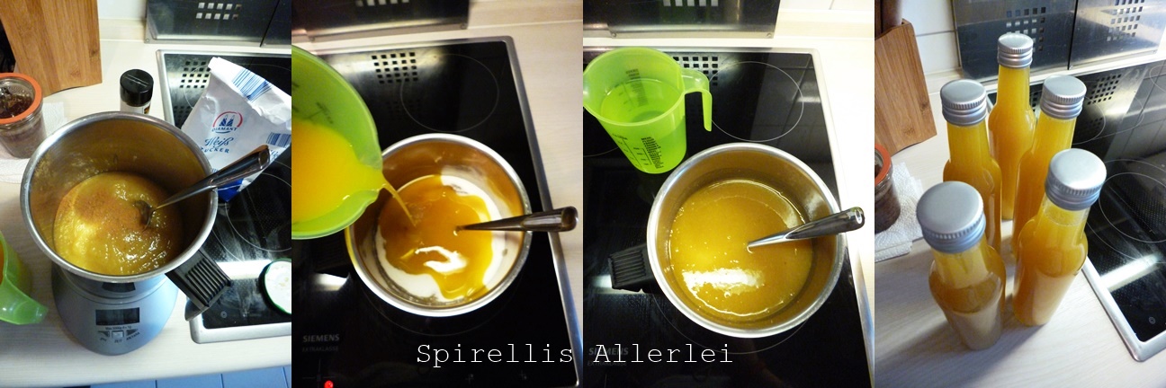 Ihr gebt den Apfelmus zusammen mit dem Mangosaft und dem Zucker in einen Topf und kocht es auf, sodass sich der Zucker auflöst. Dann nehmt ihr alles von der Flamme, gebt den Zimt dazu, wenn ihr wollt und anschließend den Vodka. Dann kann auch schon alles in Flaschen abgefüllt und verschlossen werden. Wenn er abgekühlt ist, könnt ihr ja schon ein kleines Pröbchen nehmen, immerhin müssen wir uns in so kalten Tagen (hah…) auch immer schön warm halten – das tut keiner besser als dieser Likör 😉