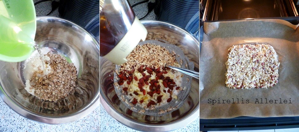 Das Mehl, die Flocken, Wasser und Öl in eine Schüssel geben und verrühren, sodass keine Mehlklümpchen mehr zu sehen sind – sonst hat der Riegel später ziemlich trockene Stellen. Nun alle restlichen Zutaten dazugeben und gut vermengen.