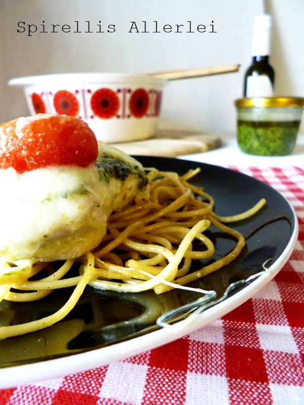 In diesem Fall hab ich zur Füllung mein Bärlauchpesto genommen, ihr könnt aber auch jedes andere Pesto verwenden, was euch gefällt und schmeckt. Und auch bei den Beilagen dürft ihr gern variieren. Statt der Nudeln kann ich mir auch prima Ofenkartoffeln vorstellen, oder Reis und ihr macht noch eine schöne Soße dazu.