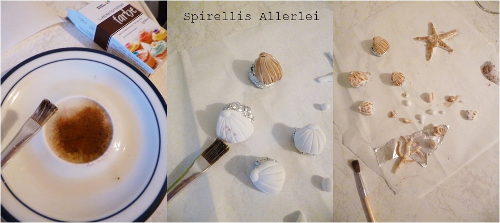 Dann mit einem Pinsel die Farbpaste auf die Muscheln und Co auftupfen. Ich habe manche komplett eingestrichen, andere nur gescheckt bzw. besprenkelt. Wie ihr sie anmalen möchtet, ist aber euch überlassen.