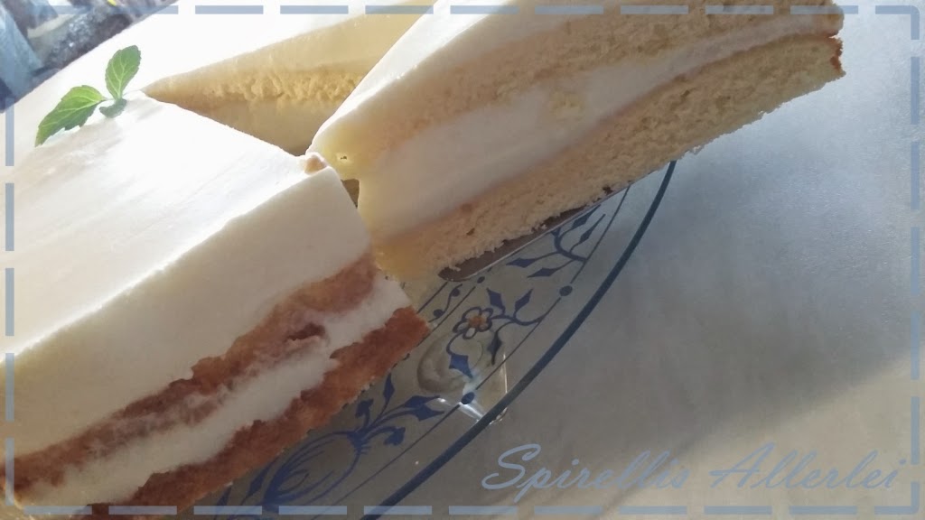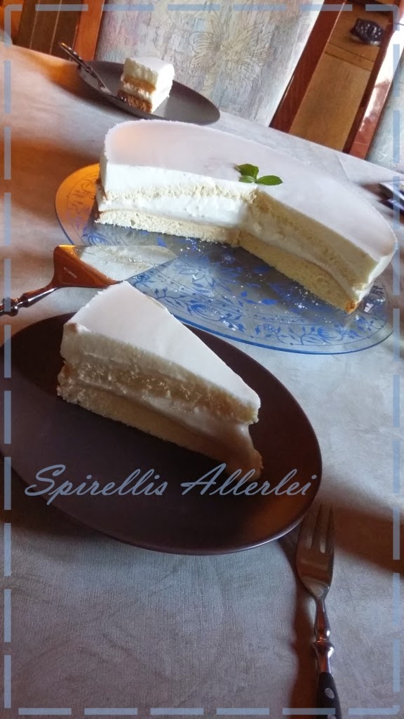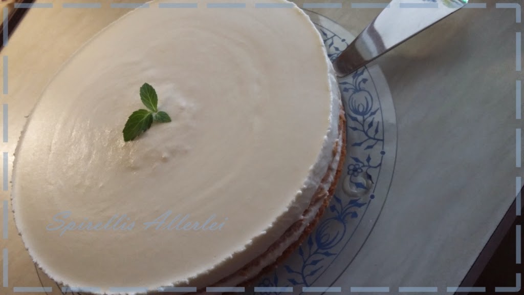 Einen Boden auf eine Tortenplatte legen und einen Backrahmen oder eine Springform umlegen. Dann 2/3 der Creme darauf geben und den zweiten Boden auflegen, nochmals mit der Creme begießen und dann für ca. 3-4 Stunden in die Kühlung stellen.