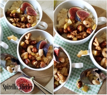 Den Milchreis auf Schüsselchen verteilen, die Apfel-Nuss-Mischung darüber geben und eventuell noch verzieren, wie in meinem Fall mit Feigen und dann geht´s ab auf die Tafel