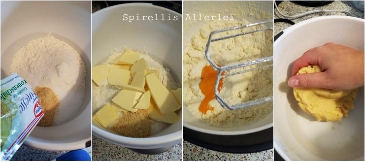 Ihr rührt Butter und Zucker cremig, dann gebt ihr die Eigelbe und das Zitronenaroma dazu. Dann wird das Mehl eingeknetet, mein Teig war dann sehr trocken, deswegen habe ich noch etwa Milch dazu gegeben. Wenn das bei euch nicht der Fall sein sollte, könnt ihr die Milch auch weglassen.